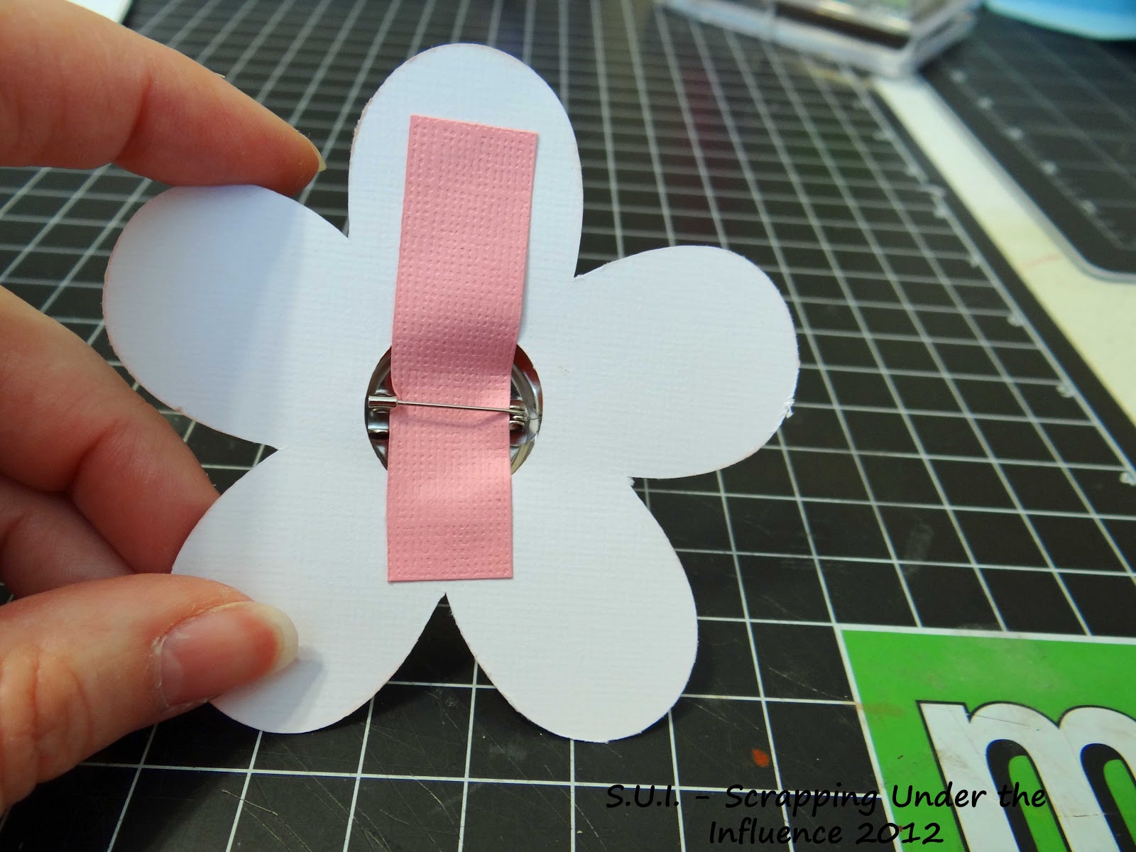 To attach the button to the front of the card I had to get a little creative. The flower I chose for the card from the Plantin Schoolbook Cricut cartridge has a hole in the center of the flower.